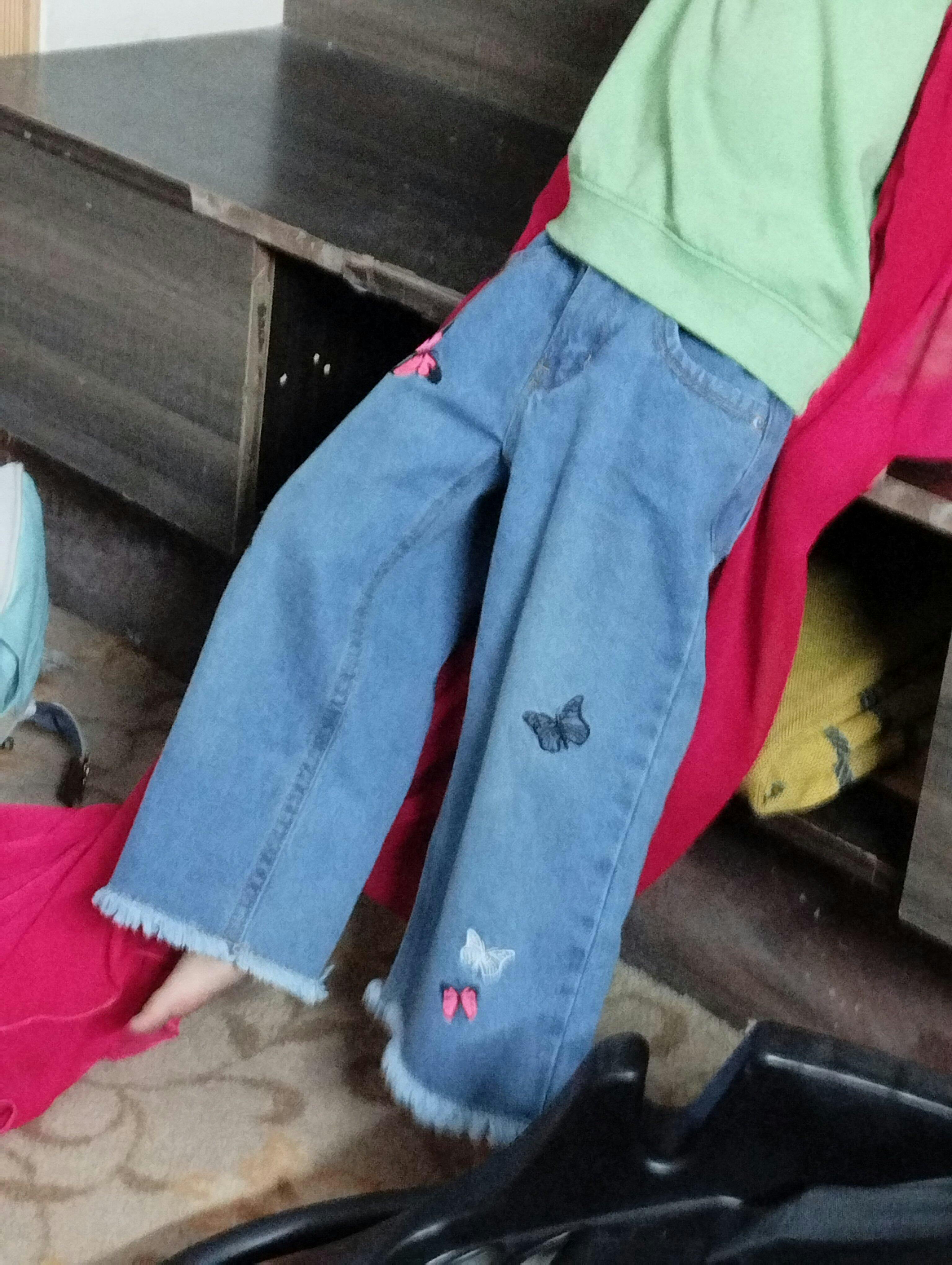 - Design: Mid-wash denim jeans with wide legs, frayed hems, and scattered butterfly embroidery for a playful, expressive finish.