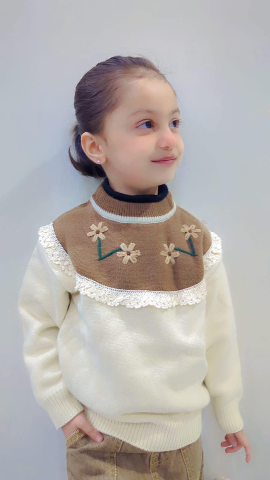 - Design: Pullover sweater with brown yoke, floral embroidery, and lace trim. Cream body features textured knit and ribbed cuffs and hem.